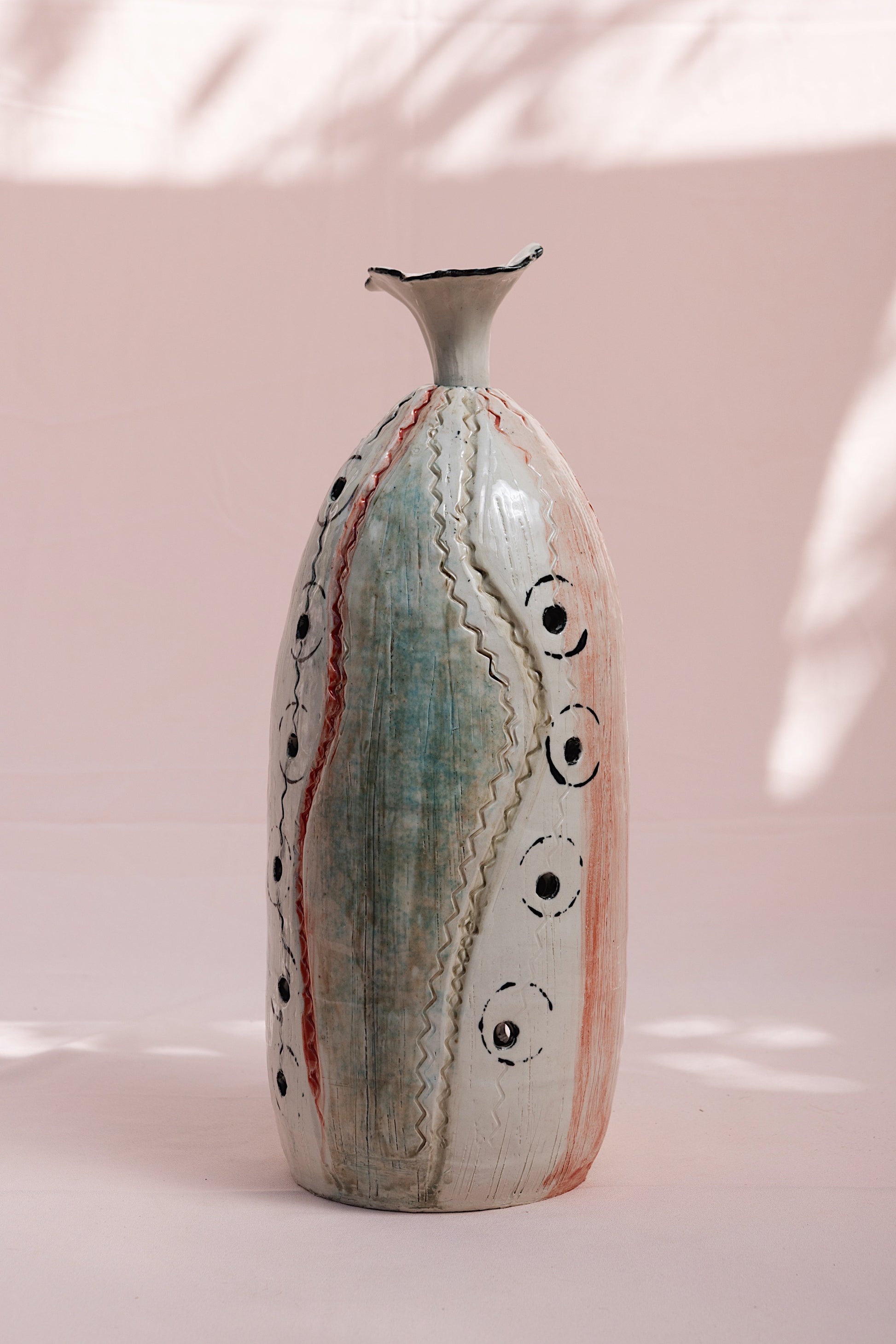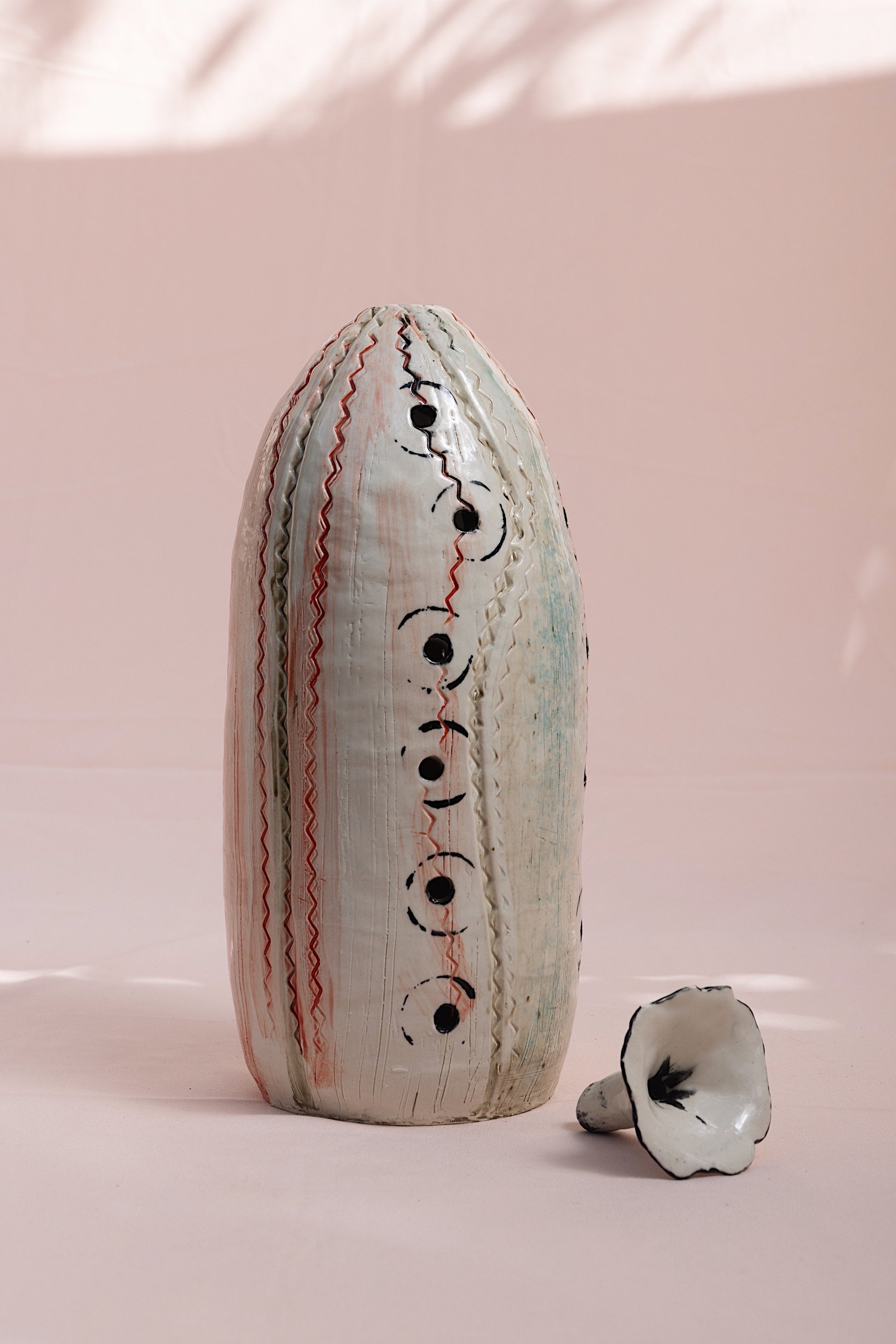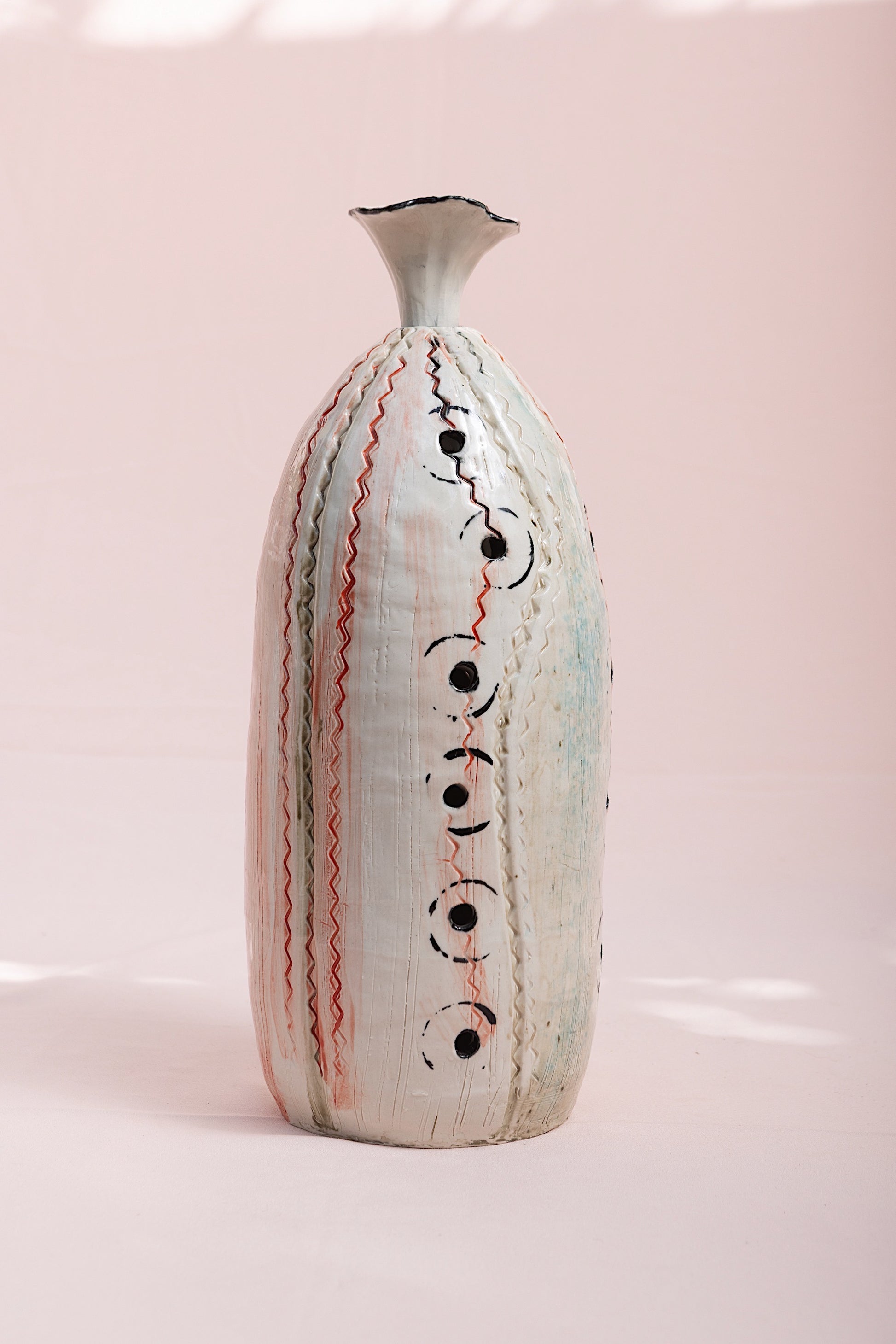 Hand-built in stoneware, Moon Thread carries the quiet rhythm of touch and breath. Its tall, organic form rises like an ancient vessel, etched with red and black lines that move in deliberate, flowing rhythm — resembling threads, constellations, or the slow stitching of time itself. The circular markings trace the phases of the moon, connecting the earthly with the celestial, the seen with the felt.