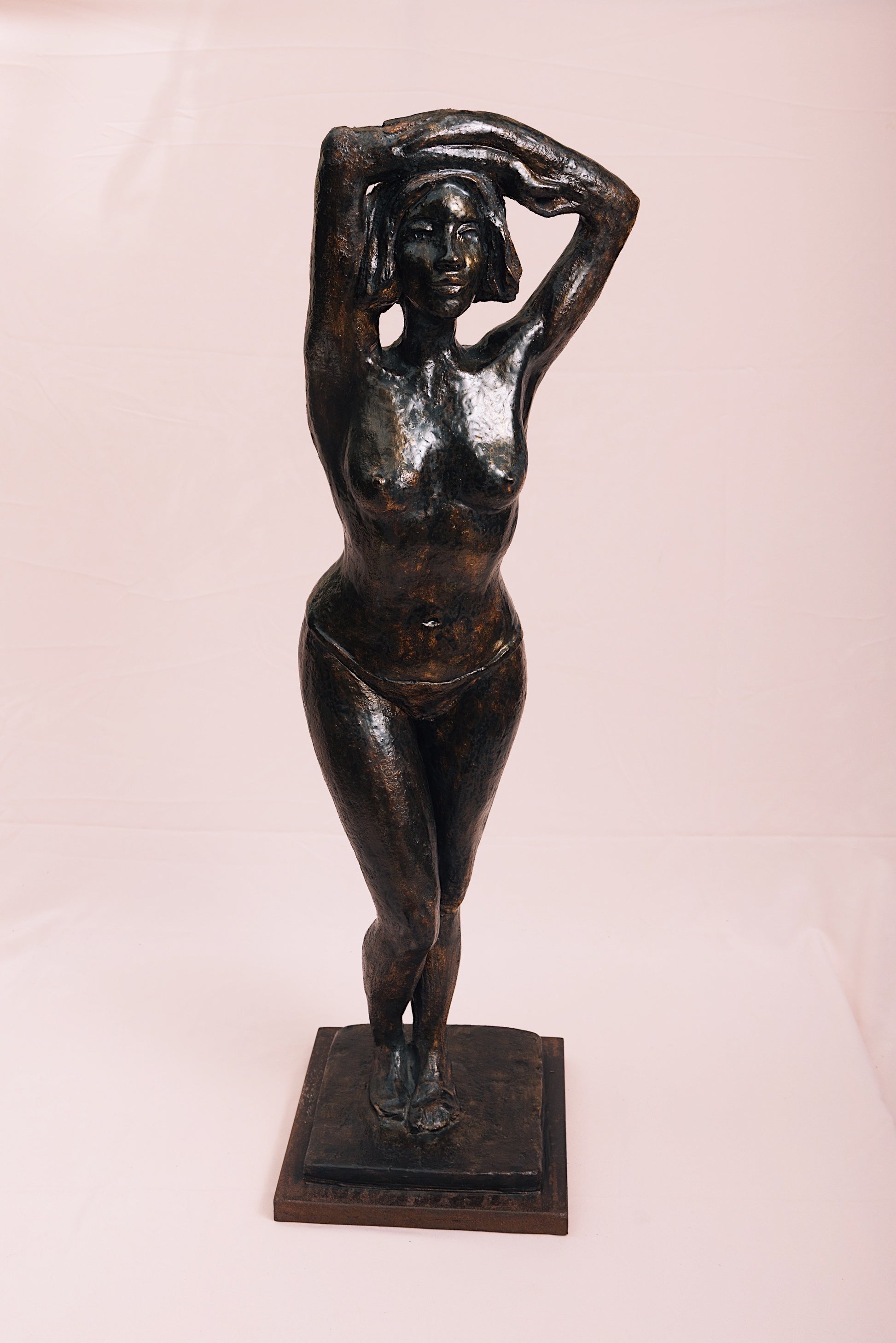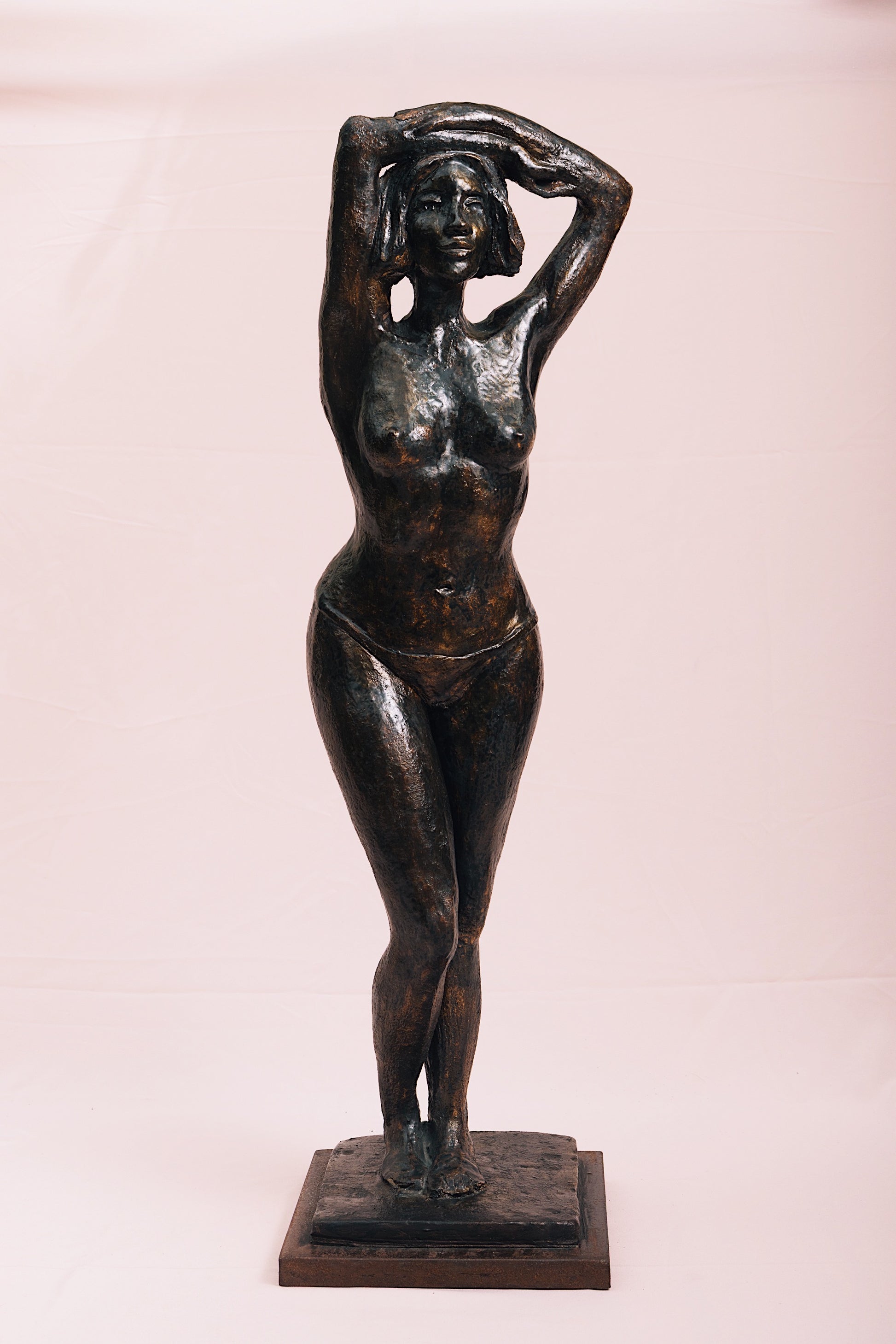 Her form rises with grace, hands resting above her head — a gesture of opening. She embodies the moment between stillness and emergence, when the feminine begins to reclaim her own rhythm, unguarded and whole.