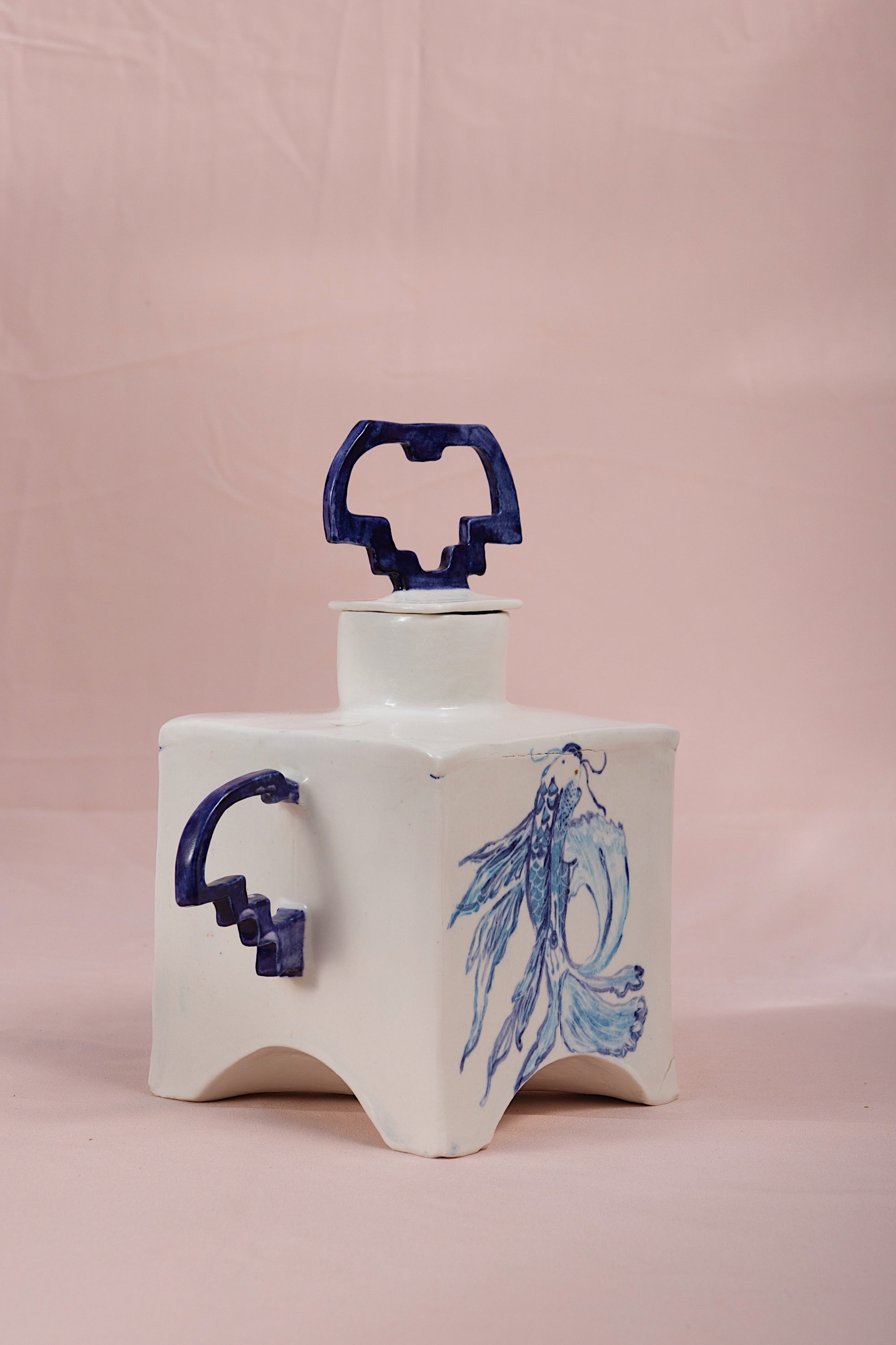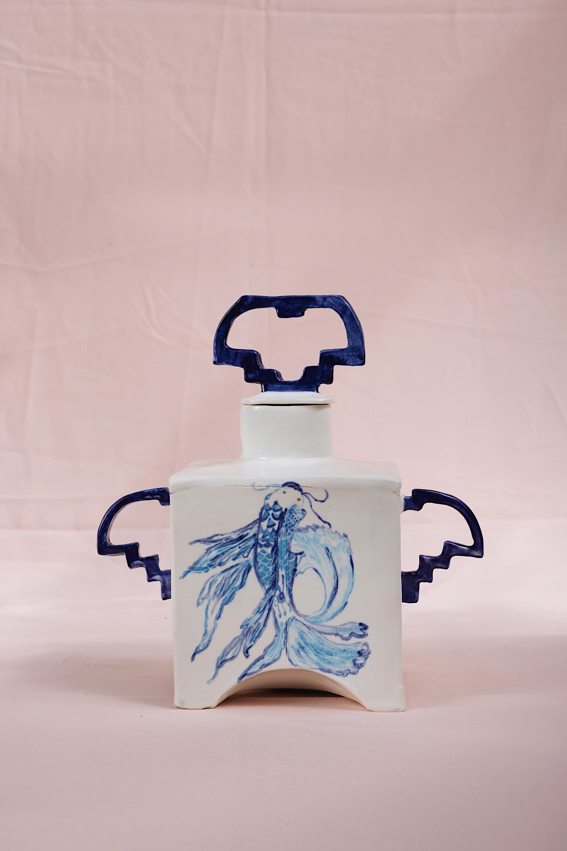 The Floating Realm draws from both Chinese and Japanese ceramic traditions, uniting structure and movement, earth and water. The vessel’s architectural form recalls ancient ritual containers of the Tang and Ming dynasties, while the flowing blue fish — painted in delicate cobalt — evokes the Japanese koi, symbol of perseverance, grace, and transformation.
