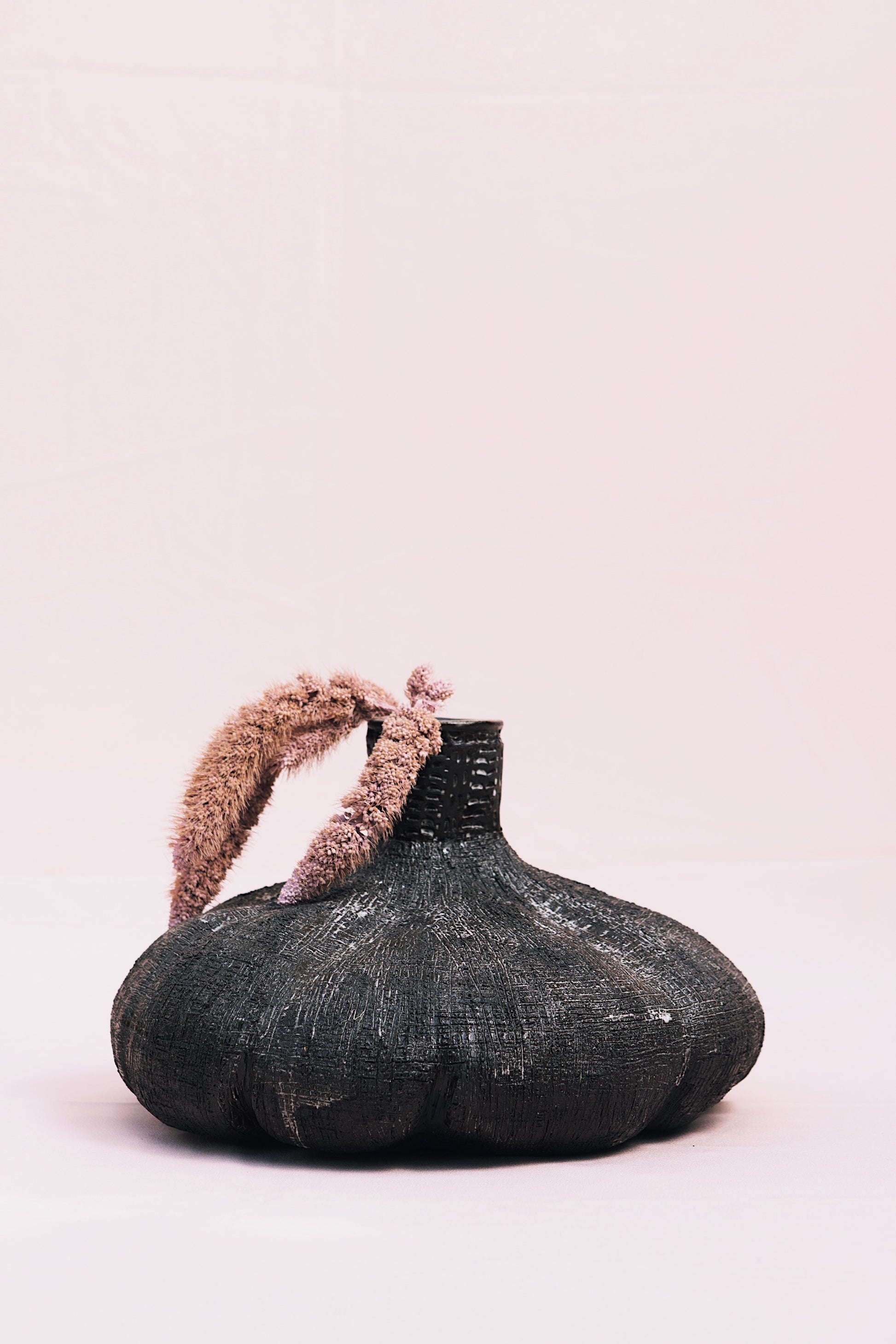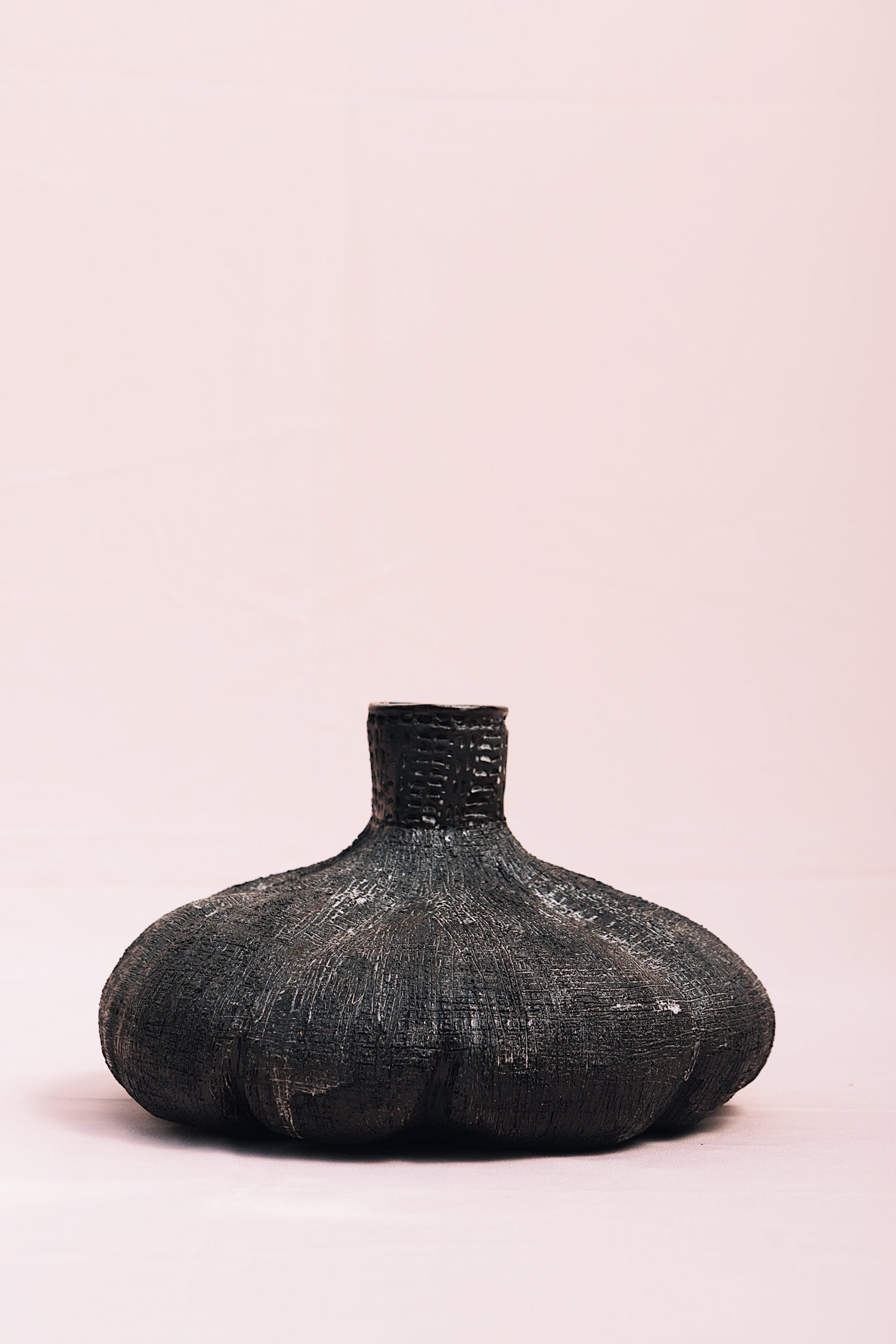 The dark, ashen body feels ancient yet alive, as if threads of clay were once soft and breathing before fire fixed them in time. It is a vessel of connection: between fragility and strength, between what is made and what endures.
